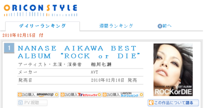Parabéns à Nanase Aikawa, em seu aniversário, mesmo dia do lançamento de seus Best albuns, estreiou em 1º como o DVD de música e 3º no Ranking geral de DVDs mais vendidos do Japão com o ROCK or DIE (CD+DVD) ~ Memorial Edition.