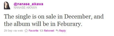 Esqueci de mencionar essa mensagem que a Nanase deixou em seu twitter no dia 29 de setembro: